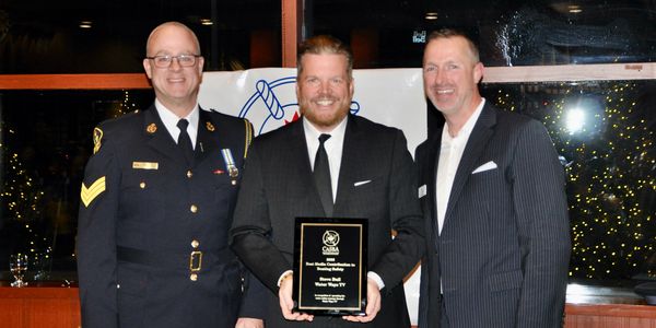 OPP Marine Unit Coordinator Sgt. Dave Moffatt and Canadian Safe Boating Council Chair Mike Dean present Water Ways Host+Producer, Steven J. Bull, with the "Best Media Contribution to Safety" Award in recognition of Water Ways safety segments within the show content.